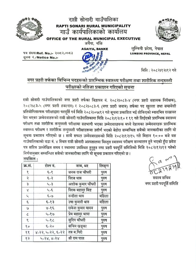 नगर प्रहरी तर्फका विभिन्न पदहरुको प्रारम्भिक स्वास्थ्य परिक्षण तथा शारीरिक तन्दुरुस्ती परिक्षाको नतिजा प्रकाशन गरिएको सूचना !!!