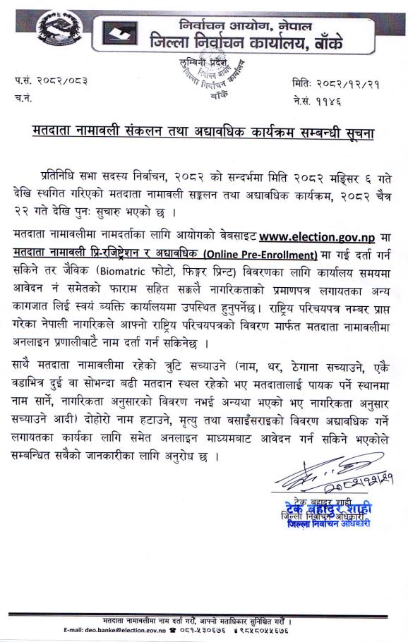 मतदाता नामावली संकलन तथा अद्यावधिक सुचारु सम्बन्धी सूचना