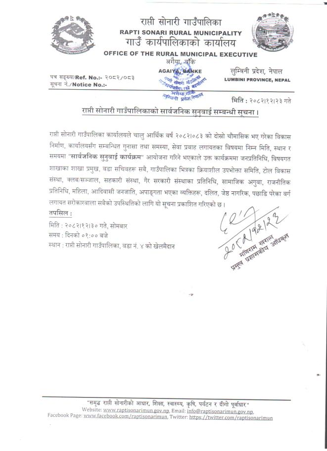 राप्ती सोनारी गाउँपालिकाको सर्वजनिक सुनुवाई सम्बन्धी सूचना !!!