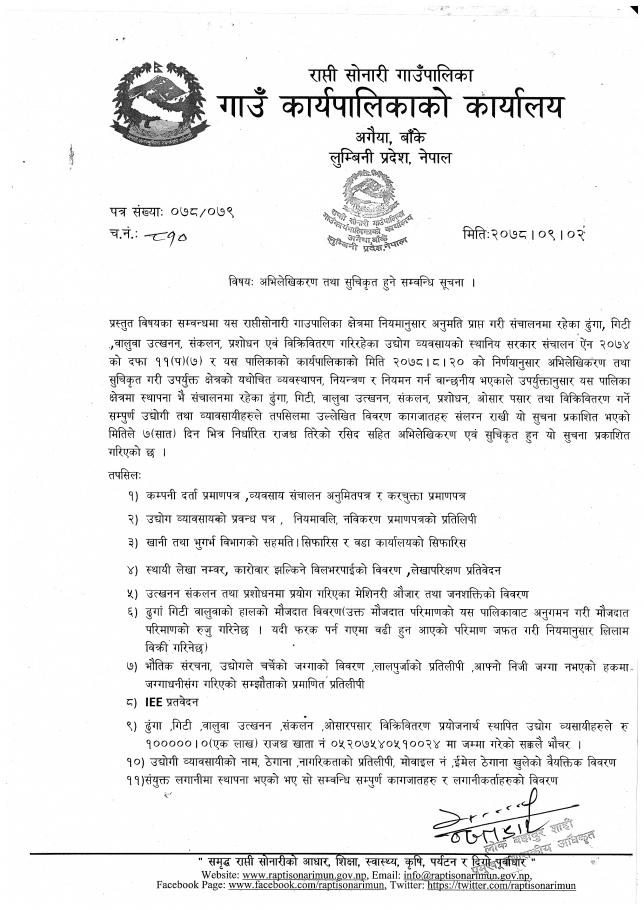 नदीजन्य पदार्थको बिक्रिका लागि बोलपत्र आह्वान सम्बन्धी सूचना!!!