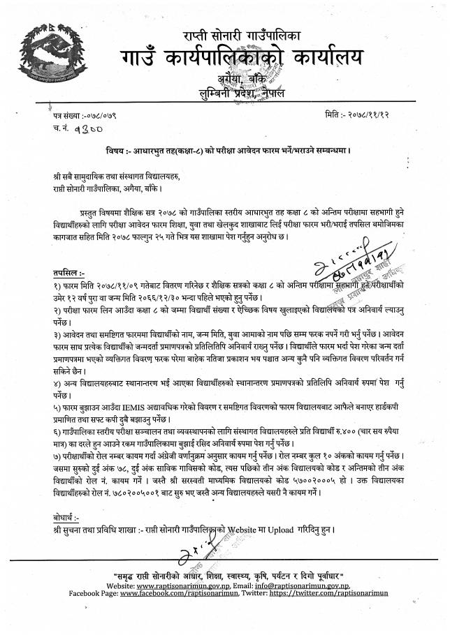 आधारभूत तह(कक्षा-८) को परिक्षा आवेदन फारम भर्ने/भराउने सम्बन्धमा श्री राप्ती सोनारी गाउँपालिका अन्तर्गत सम्पुर्ण बिद्यालयहरु