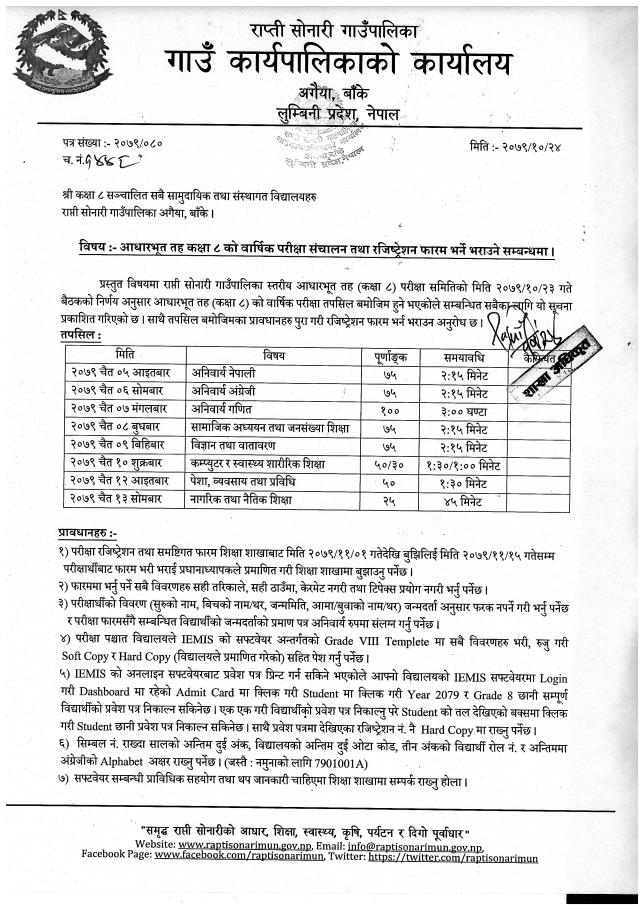 आधारभूत तह कक्षा ८ को वार्षिक परीक्षा संचालन तथा रजिष्ट्रेशन फारम भर्ने भराउने सम्बन्धमा (प्रकाशित मिति २०७९/१०/२४)