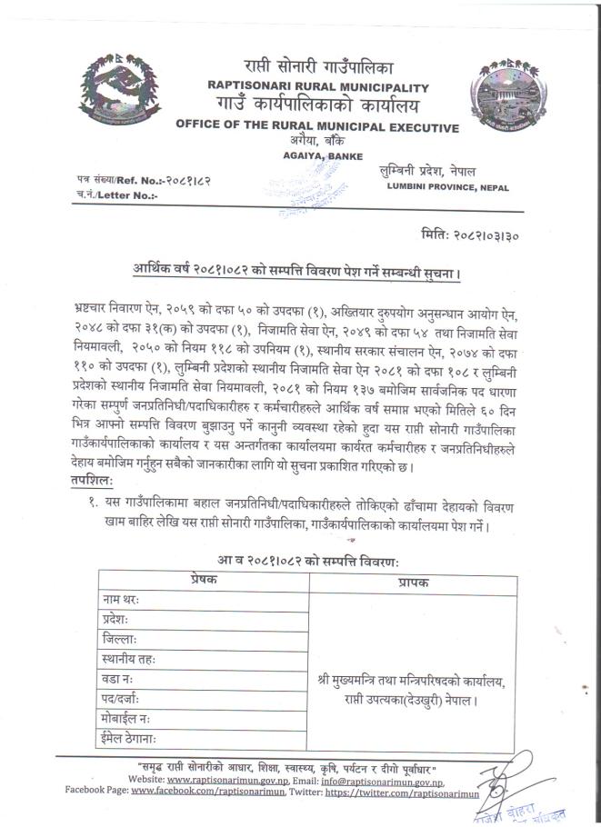 आ.ब २०८१/०८२ को सम्पत्ति विवरण पेश गर्ने सम्बन्धी सूचना
