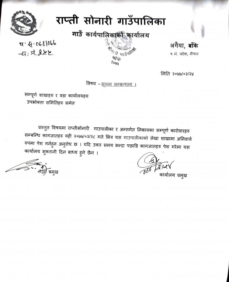 आर्थिक कारोवार सम्बन्धी कागजात ०७७-३-२८ गते भित्र पेश गर्ने सम्बन्धी सूचना!! (प्रकशित मिति २०७७/३/२४ गते)