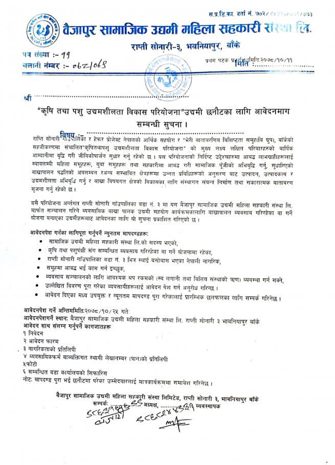 "कृषि तथा पशु उद्यमशीलता विकास परियोजना" उद्यमी छनौटका लागि आवेदनमाग सम्बन्धि सुचना