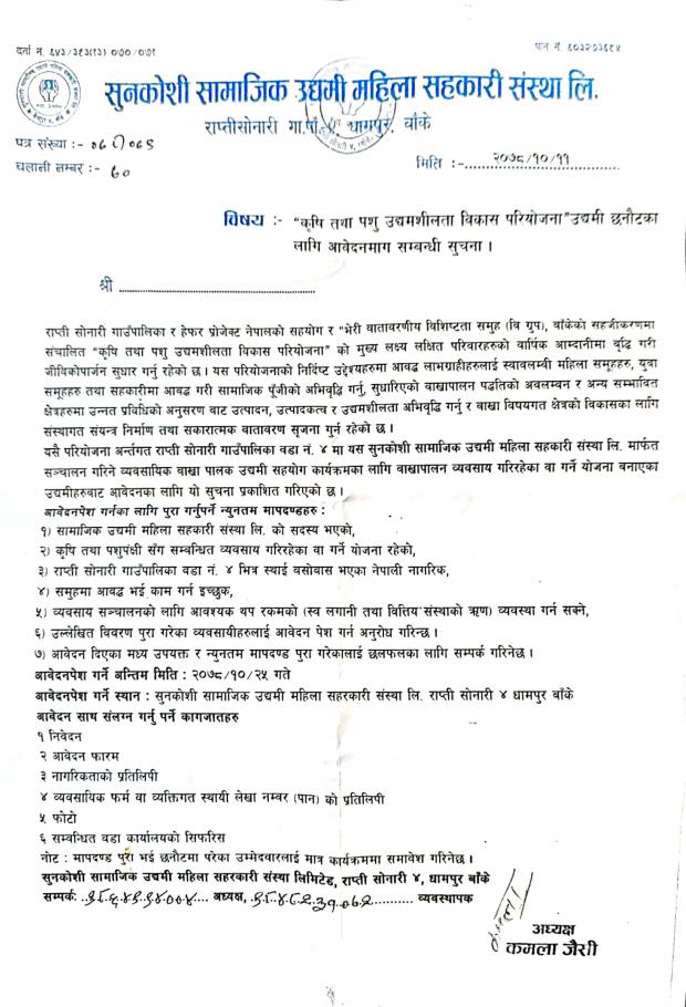 » कृषि तथा पशु उद्यमशीलता विकास परियोजना "उद्यमी छनौटका लागि आवेदनमाग सम्बन्धी सूचना