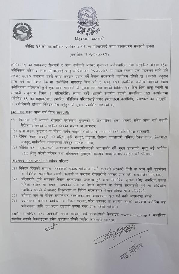 » कोभिड-१९ को महामारीबाट प्रभावित अतिविपन्न परिवारलाई नगद हस्तान्तरण सम्बन्धी सुचना (प्रकाशित मिति २०७८/०८/०१)