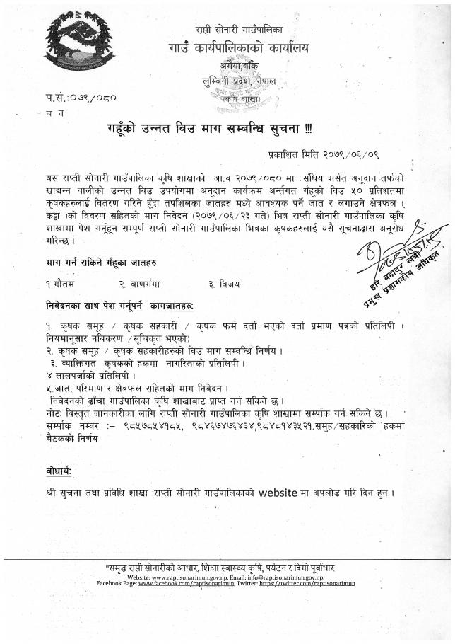 गहुँको उन्नत विउ माग सम्बन्धि सूचना !!!