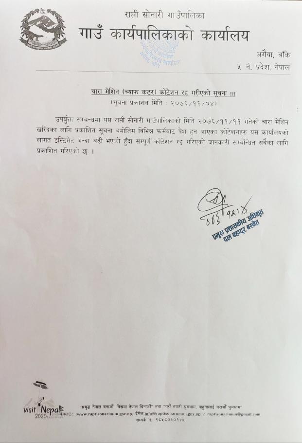 चारा मेशिन (च्याफ कटर) को कोटेशन रद्द गरिएको सूचना !!! (प्रकाशित मित ०७६/१२/०४