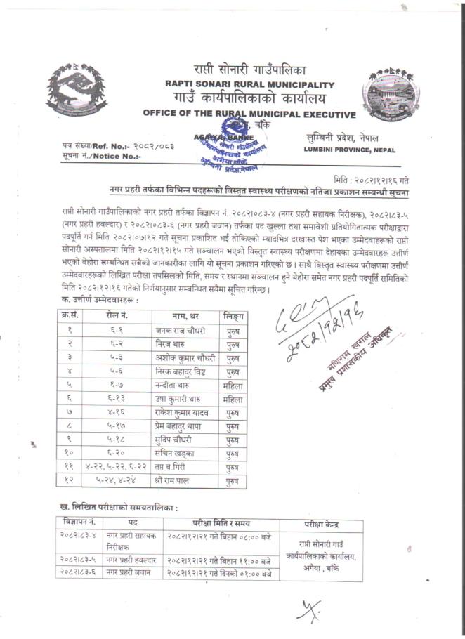 नगर प्रहरी तर्फका विभिन्न पदहरुको प्रारम्भिक स्वास्थ्य परिक्षण तथा शारीरिक तन्दुरुस्ती परिक्षाको नतिजा प्रकाशन गरिएको सूचना !!!
