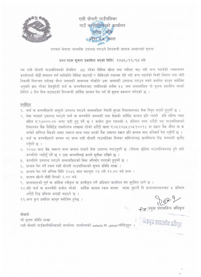नदिजन्य पदार्थको व्यवस्थापनका लागि परामर्श सेवामा जनशक्ति उपलब्ध गराउने शिलबन्दी प्रस्ताव आह्वानको ७ दिने सूचना (प्रकाशित मित २०७६/११/१७)