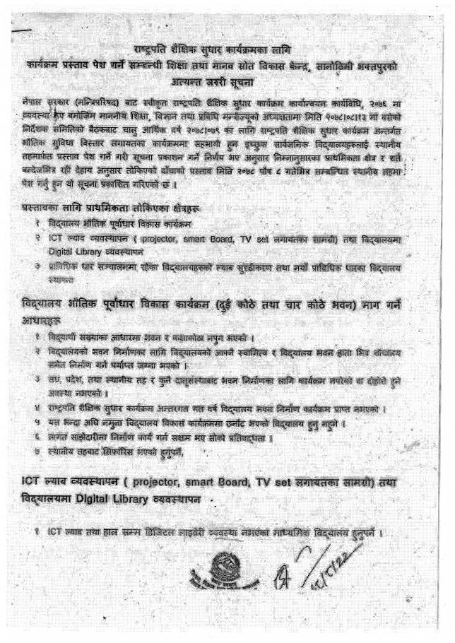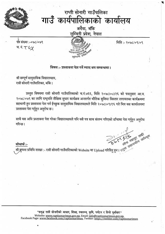 » प्रस्तावना पेश गर्ने म्याद थप सम्बन्धमा श्री राप्ती सोनारी गाउँपालिका अन्तर्गतका सम्पूर्ण सामुदायिक विद्यालयहरु (प्रकाशित मिति २०७८/०९/०९)
