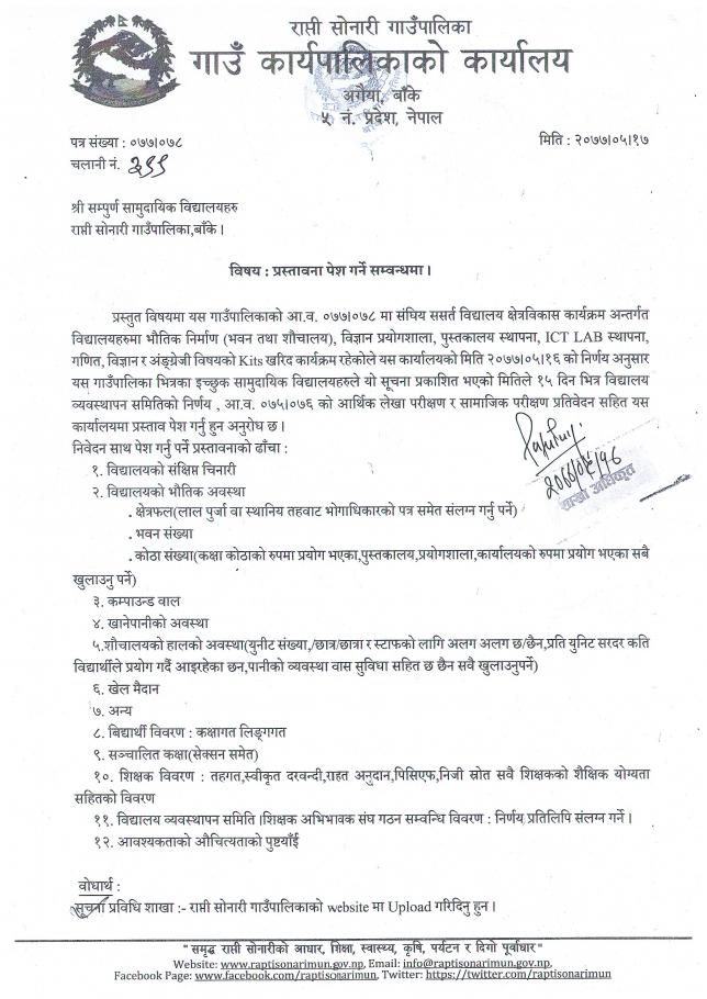 प्रस्तावना पेश गर्ने सम्बन्धी १५ दिने सूचना !!!(श्री सम्पूर्ण सामुदायिक विद्यालयहरु, राप्ती सोनारी गा.पा. अन्तर्गत) प्रकाशित मिति ०७७/५/१७)