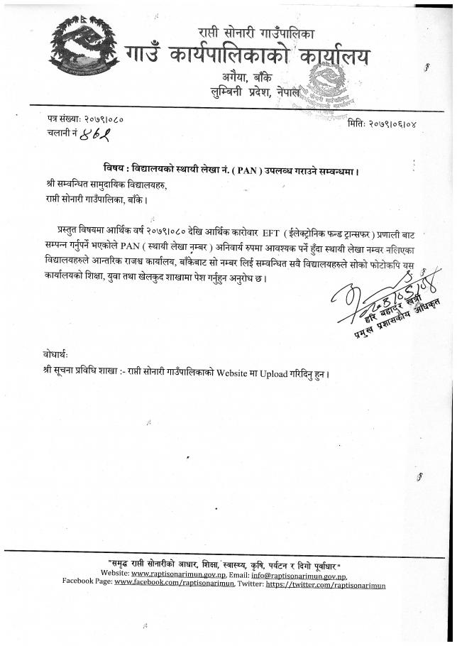 » बिद्यालयको स्थायी लेखा नं. (PAN) उपलब्ध गराउने सम्बन्धमा (प्रकाशित मिति २०७९/०६/०४)