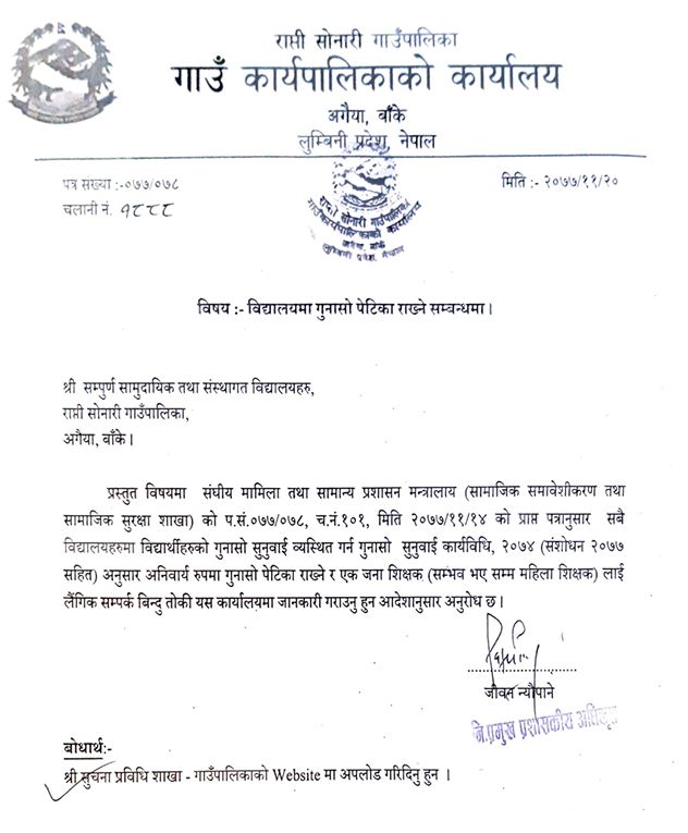 बिद्यालयमा गुनासो पेटीका राख्ने सम्बन्धमा प्रकाशित मिति (०७७-११-२०)