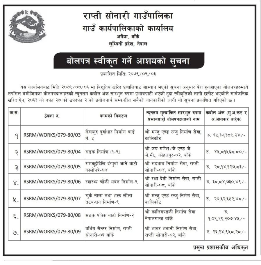 » बोलपत्र स्वीकृत गर्ने आशयको सूचना