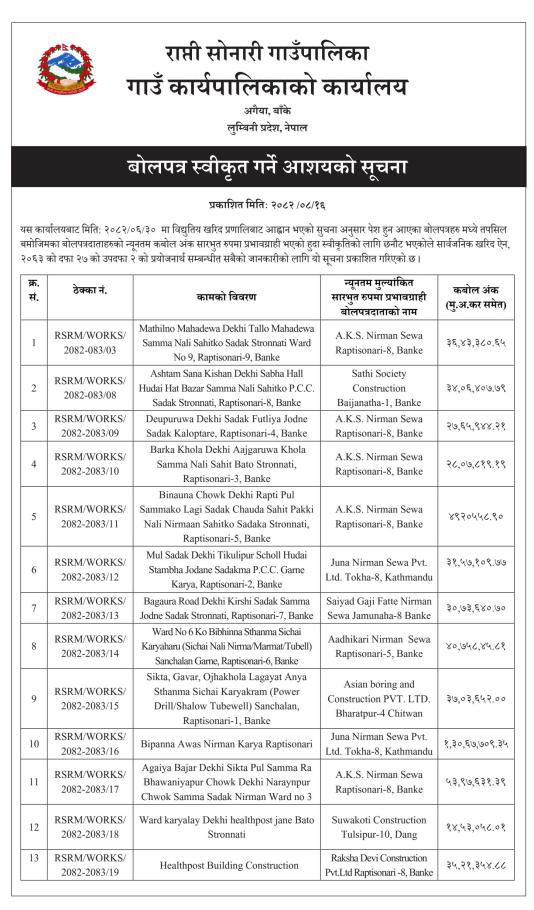 » बोलपत्र स्वीकृत गर्ने आशयको सूचना !!!
