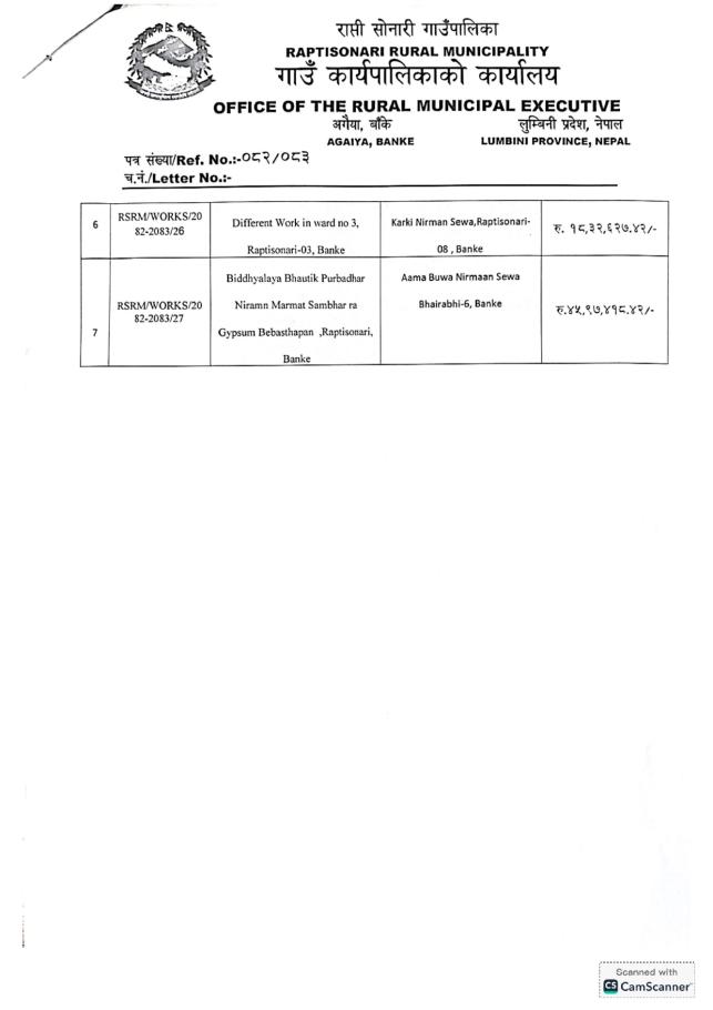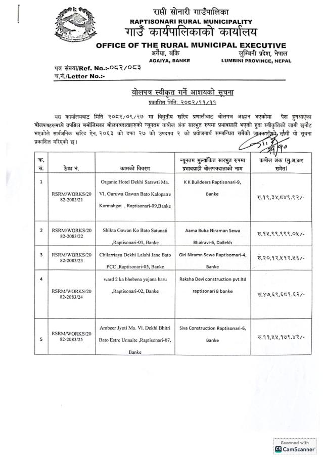 बोल पत्र स्वीकृत गर्ने आशयको सूचना