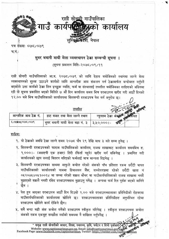 » भुवर भवानी माघी मेला व्यवस्थापन ठेक्का सम्बन्धि सूचना (प्रकाशित मिति २०७८/०९/११)