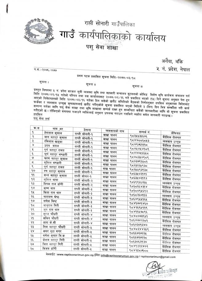 सूचना प्रकाशित भएको मिति देखि ३ दिन (सार्वजनिक विदा बाहेक) भित्र राप्ती सोनारी गाउँपालिकाको पशु सेवा शाखामा सम्झौता गर्न आउनु हुन सम्बन्धित सबैलाई जानकारी गराइन्छ ।