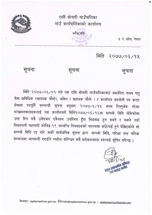 मिति २०७७/०६/०१ गते प्रकाशित अमिन, ना.प.से.प्रा. र कार्यालय सहयोगी पदको सम्पर्क मिति सम्बन्धि सूचना !!! (प्रकाशित मिति २०७७/०६/१५)