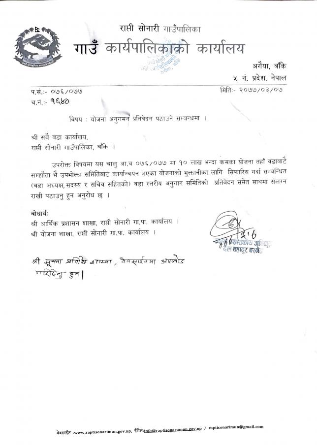 योजना अनुगमन प्रतिवेदन पठाउने सम्बन्धमा(श्री सबै वडा कार्यालय, राप्ती सोनारी गा.पा. कार्यालय)