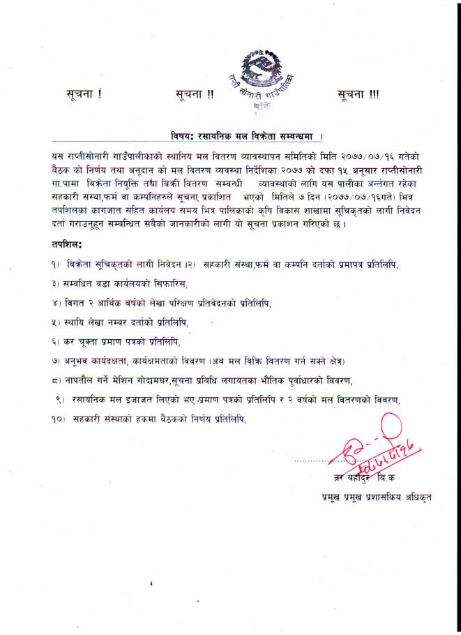 रसायनिक मल विक्रेताका लागि राप्ती सोनारी गा.पा. अन्तर्गतका सहकारी संस्था/फर्म/कम्पनिहरु सुचिकृत हुन आउने सम्बन्धि ७ दिने सूचना !!! (प्रकाशित मिति ०७७/७/१६)