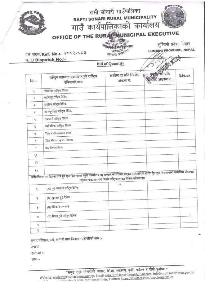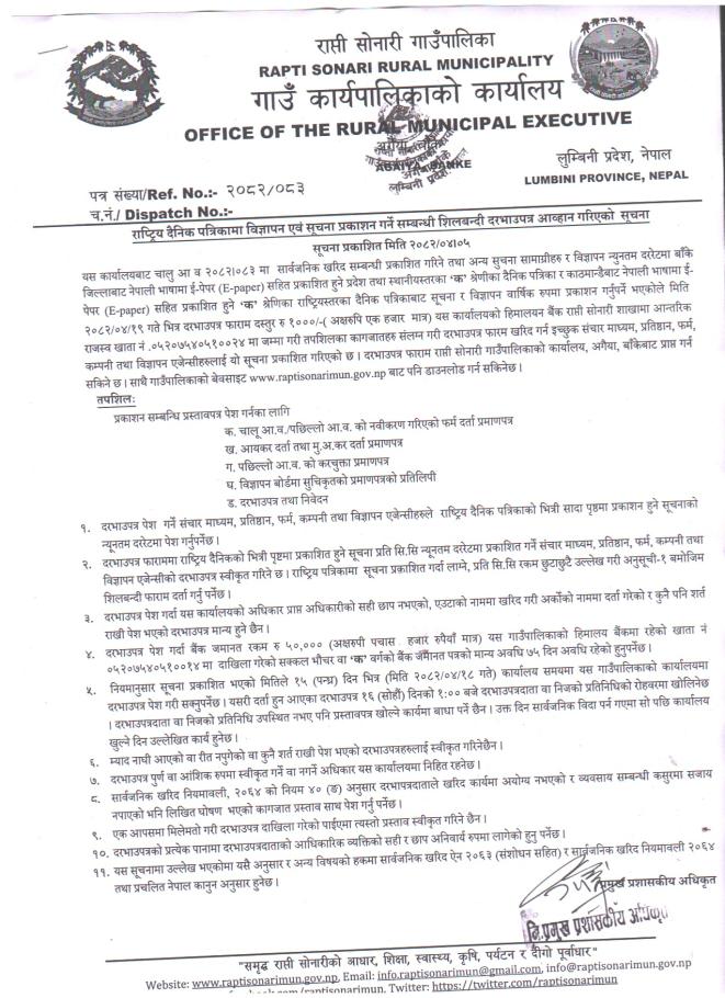 राष्ट्रिय दैनिक पत्रिकामा विज्ञापन एव सूचना प्रकाशन गर्ने सम्बन्धी शिलबन्दी दरभाउपत्र आहवान गरिएको सूचना !!!