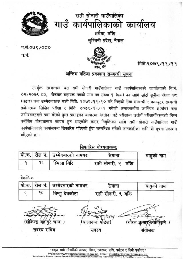रोजगार प्राबिधिक सहायक,रोजगार सहायक र विद्यालय स्टाप नर्सको अन्तिम नतिजा प्रकाशन सम्बन्धमा (प्रकाशित मिति २०७९/११/१०)