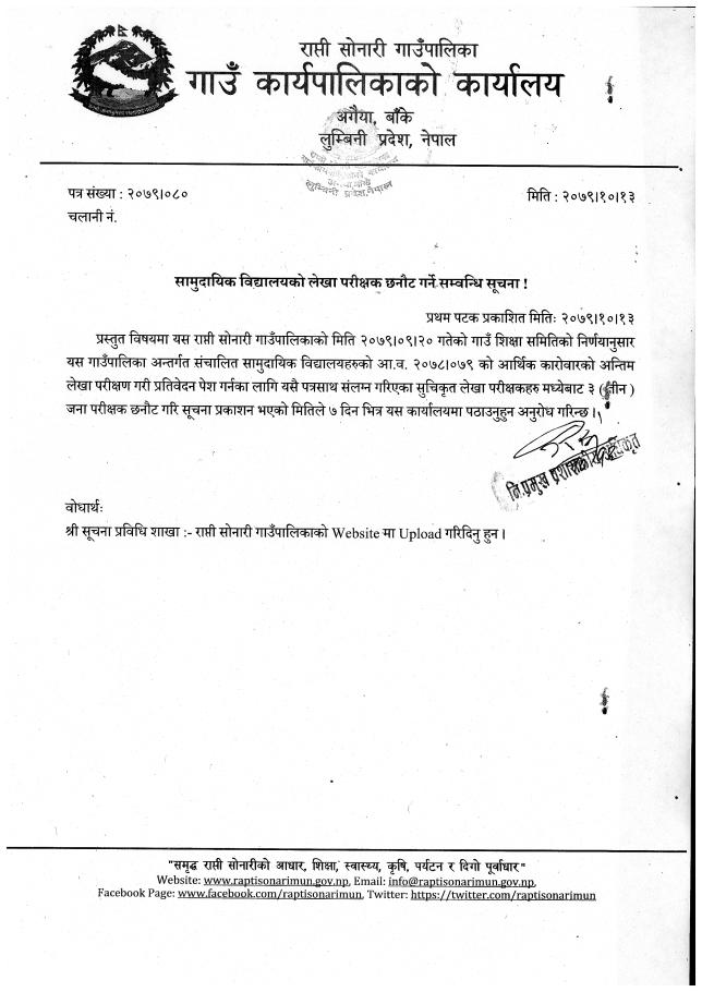 सामुदायिक बिद्यालयको लेखा परीक्षक छनौट गर्ने सम्बन्धि सुचना !