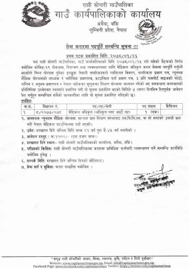 सेवा करारमा (मेडिकल अधिकृत) पदपूर्ति सम्बन्धि ७ दिने सूचना !!!